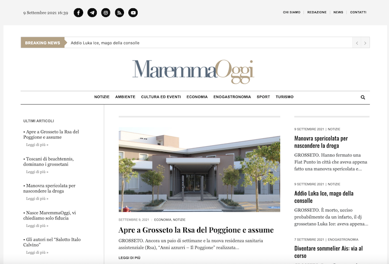 Si chiama MaremmaOggi, il nuovo quotidiano digitale che racconta il territorio della Maremma. Notizie ma anche rubriche e approfondimenti su turismo, enogastronomia, ambiente ed eccellenze del territorio, oltre a tanta cultura e all’immancabile spazio per lo sport. Come annunciato nell’editoriale di presentazione, tra gli aspetti che caratterizzeranno lo stile di MaremmaOggi ci sono la chiarezza nell’esposizione delle notizie, l’attenzione scrupolosa alla verifica dei fatti e la curiosità nel raccontare ogni aspetto del territorio. Non mancheranno, infine, le inchieste. Il nuovo quotidiano è gratuito e consente di registrarsi per ricevere le notizie direttamente tramite newsletter. Da Odg Toscana i migliori auguri per questa nuova avventura editoriale.